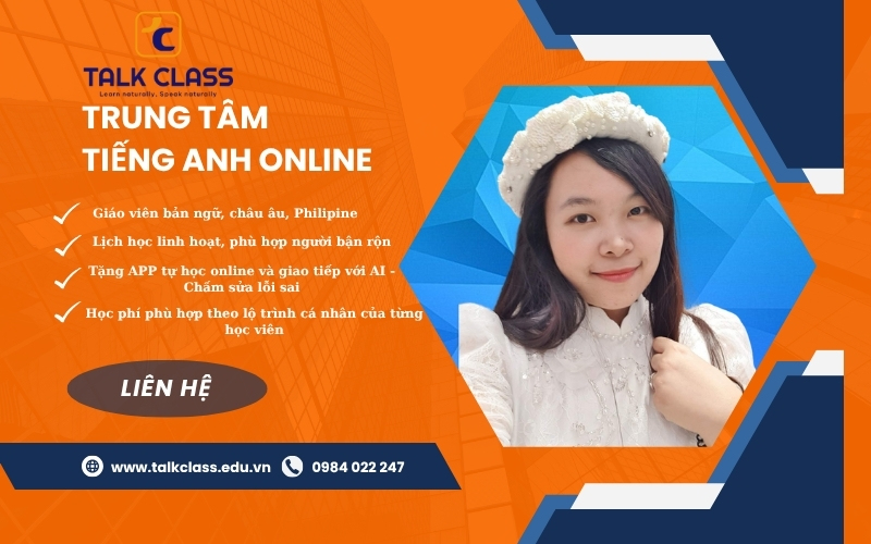 | Talk Class | Tập trung phản xạ ngôn ngữ, giao tiếp thực tế | 1 kèm 1 hoặc nhóm nhỏ, trực tuyến với giáo viên bản xứ | Người đi làm, người bận rộn, cần tiếng Anh chuyên ngành | Linh hoạt theo lộ trình cá nhân | Có app tự học + AI chấm lỗi |